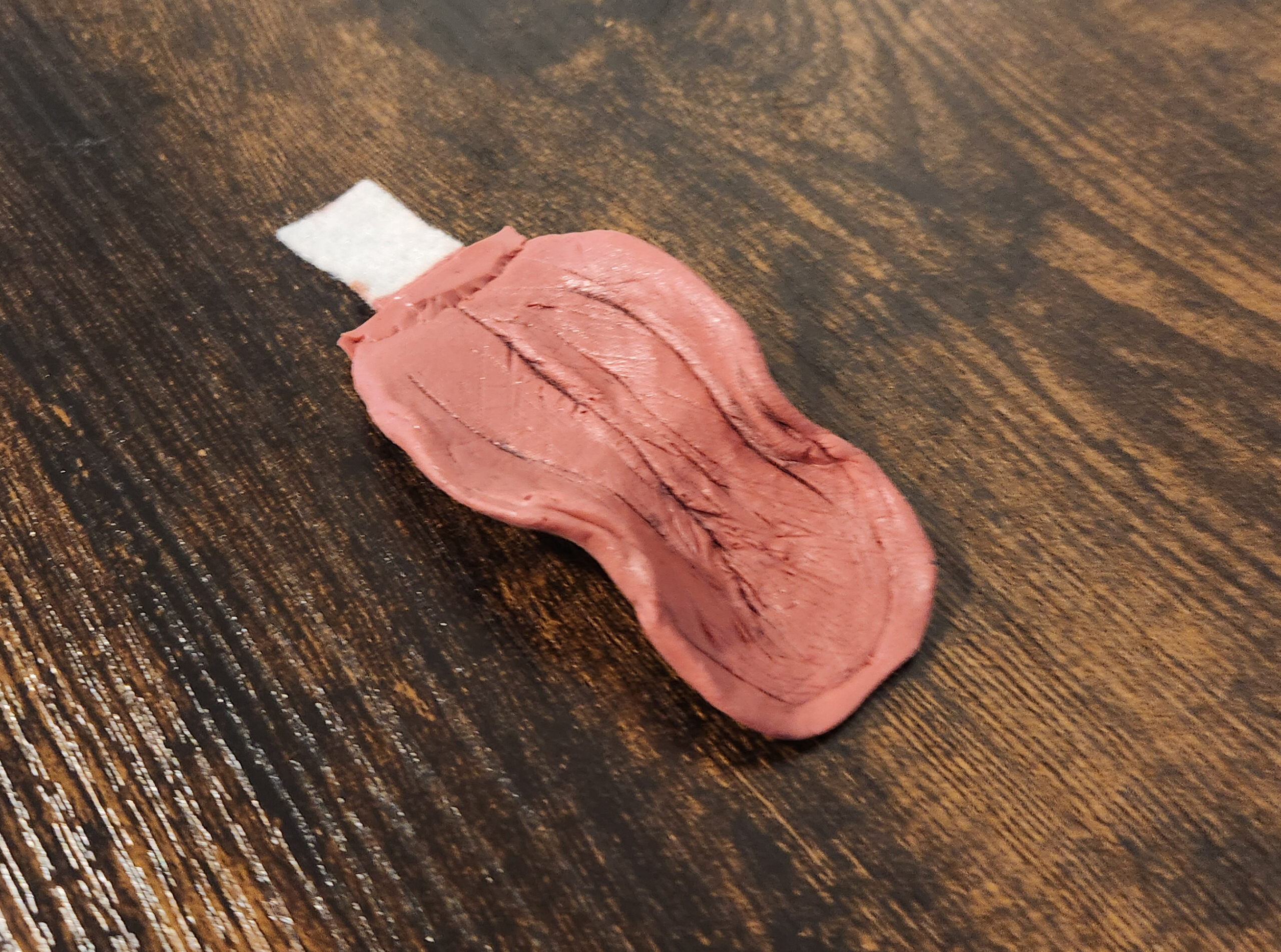 Rubber tongue, molded and cast in highly flexible urethane rubber with a dark mauve pink color. Felt fabric core to prevent tear and to easily glue or sew the end into masks. Fits canine base masks such as the werewolf, animatronic werewolf and wolf.